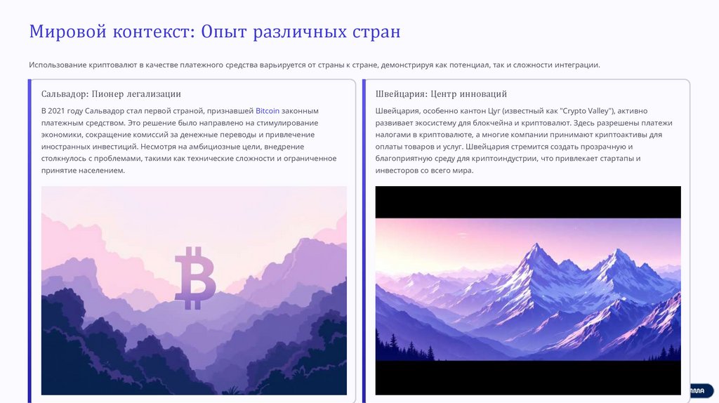 Мировой контекст: Опыт различных странИспользование криптовалют в качестве платежного средства варьируется от страны к стране, демонстрируя как потенциал, так и сложности интеграции.