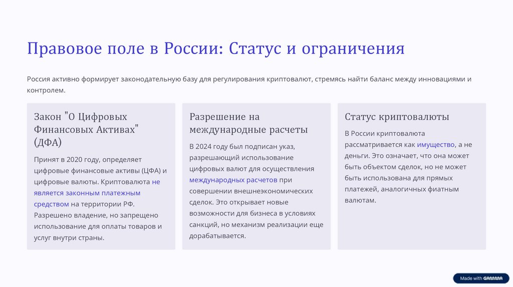 Правовое поле в России: Статус и ограниченияРоссия активно формирует законодательную базу для регулирования криптовалют, стремясь найти баланс между инновациями и
