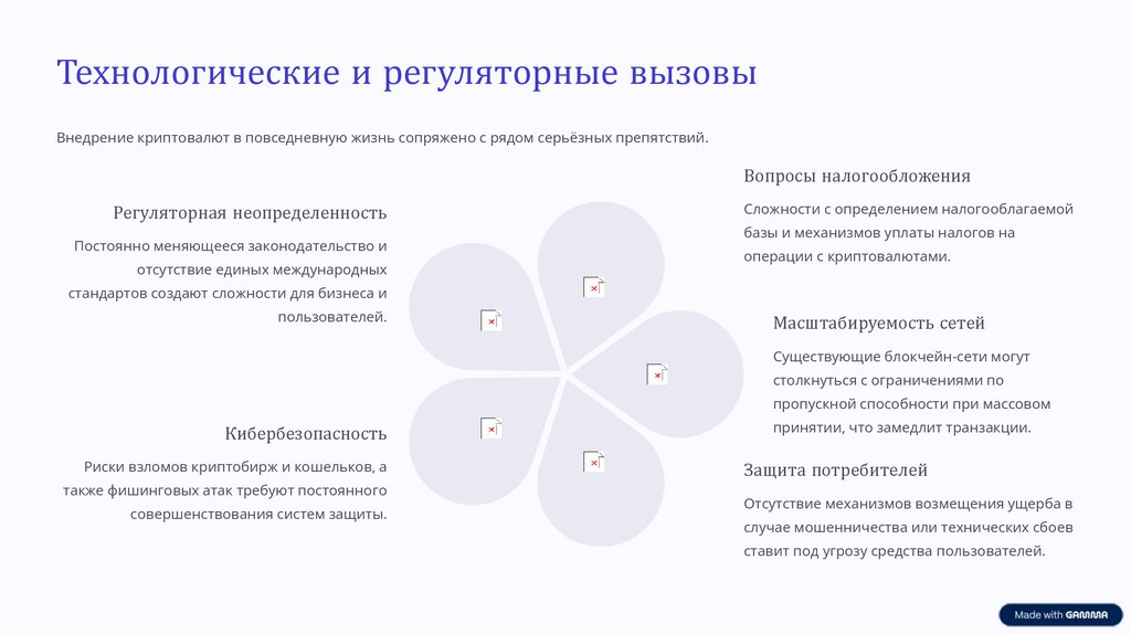 Технологические и регуляторные вызовыВнедрение криптовалют в повседневную жизнь сопряжено с рядом серьёзных препятствий.