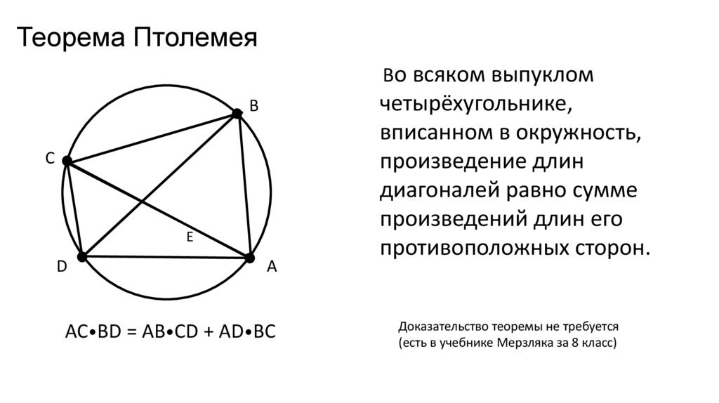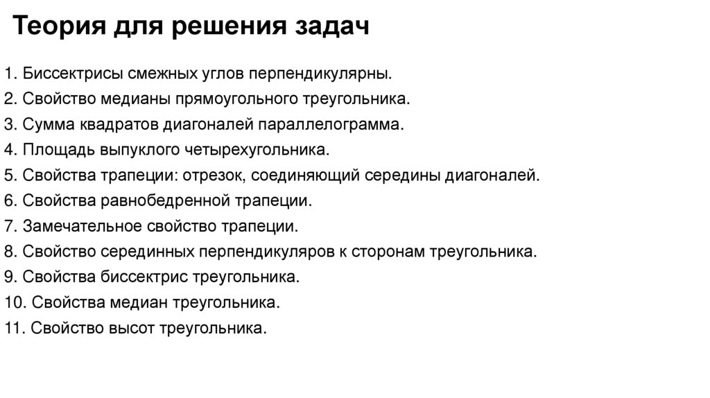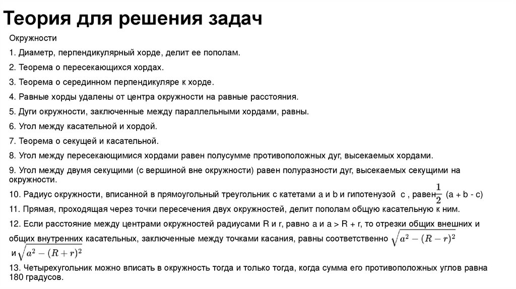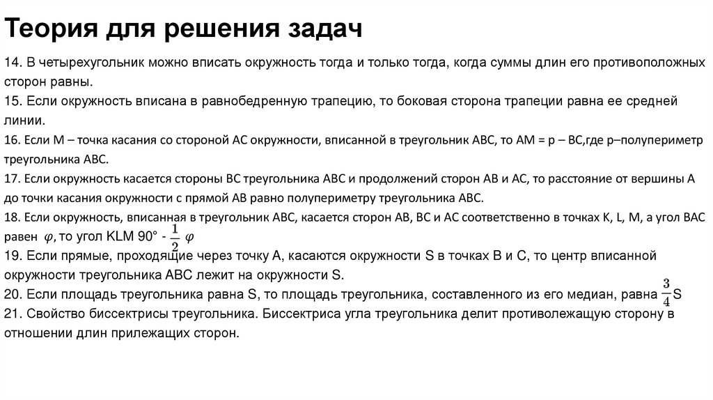 Теория для решения задач14. В четырехугольник можно вписать окружность тогда и только тогда, когда суммы длин его противоположных