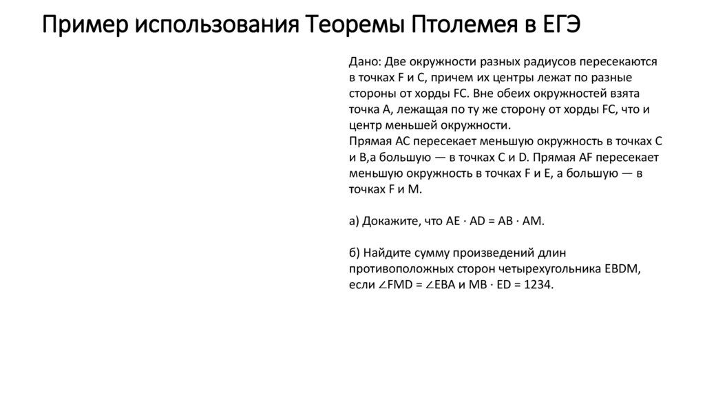 Пример использования Теоремы Птолемея в ЕГЭДано: Две окружности разных радиусов пересекаются
