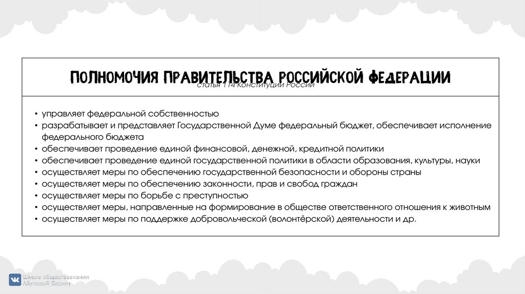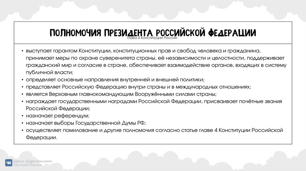 • осуществляет помилование и другие полномочия согласно статье главе 4 Конституции Российской