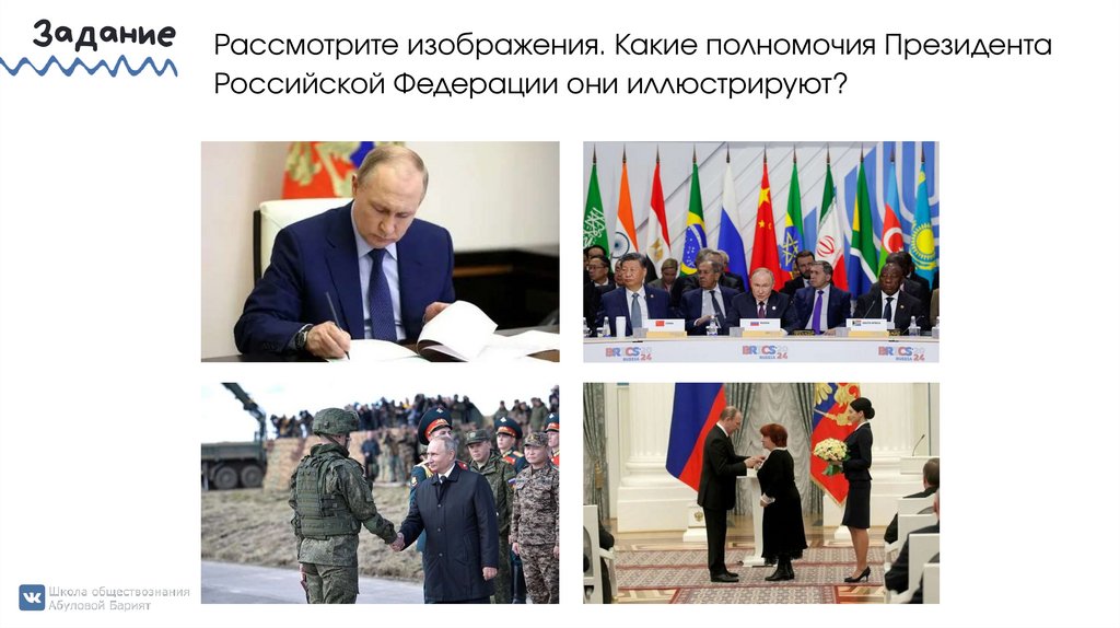 ЗаданиеРассмотрите изображения. Какие полномочия Президента