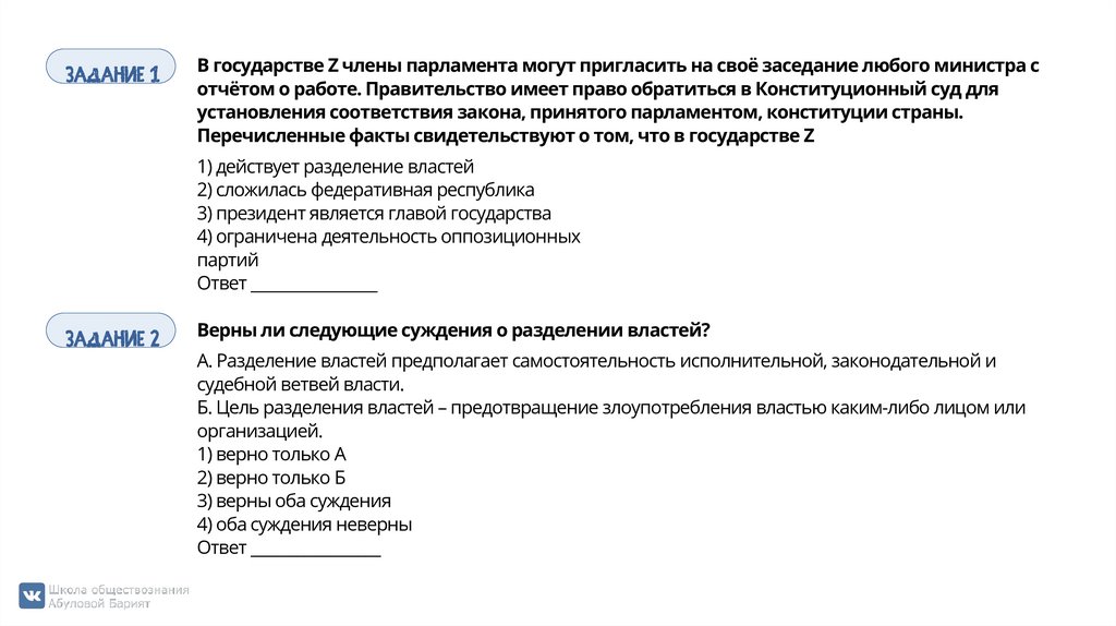 В государстве Z члены парламента могут пригласить на своё заседание любого министра сотчётом о работе. Правительство имеет право обратиться в Конституционный суд для