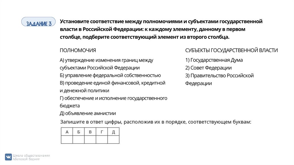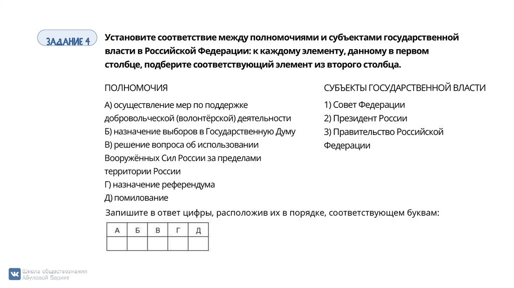 Установите соответствие между полномочиями и субъектами государственнойвласти в Российской Федерации: к каждому элементу, данному в первом