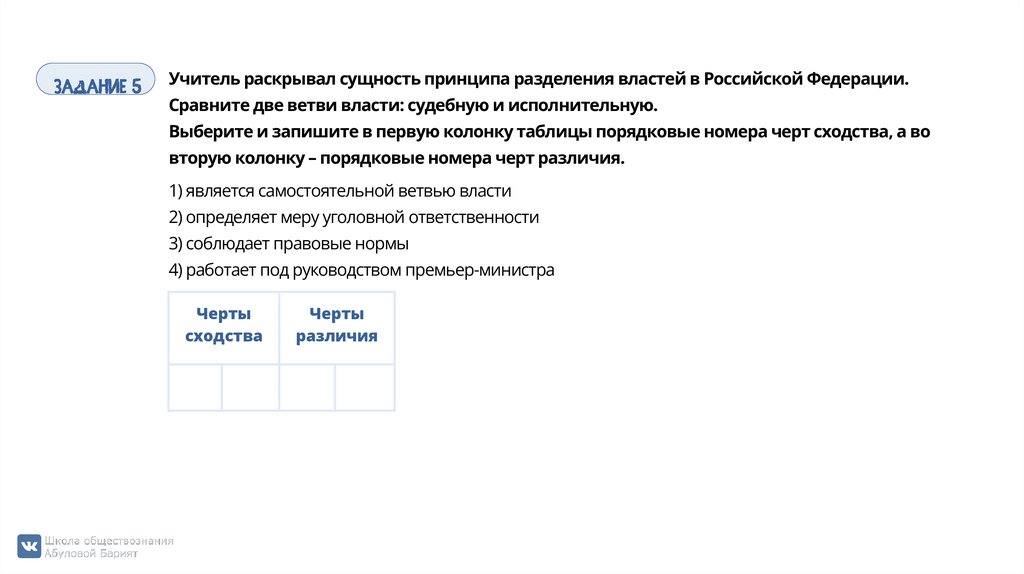 Учитель раскрывал сущность принципа разделения властей в Российской Федерации.Сравните две ветви власти: судебную и исполнительную.