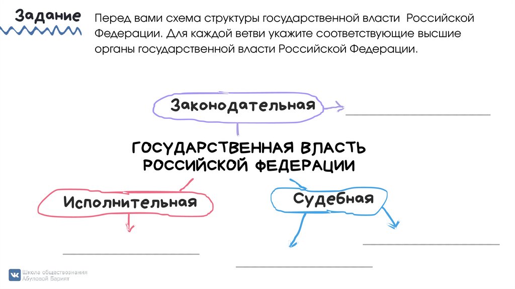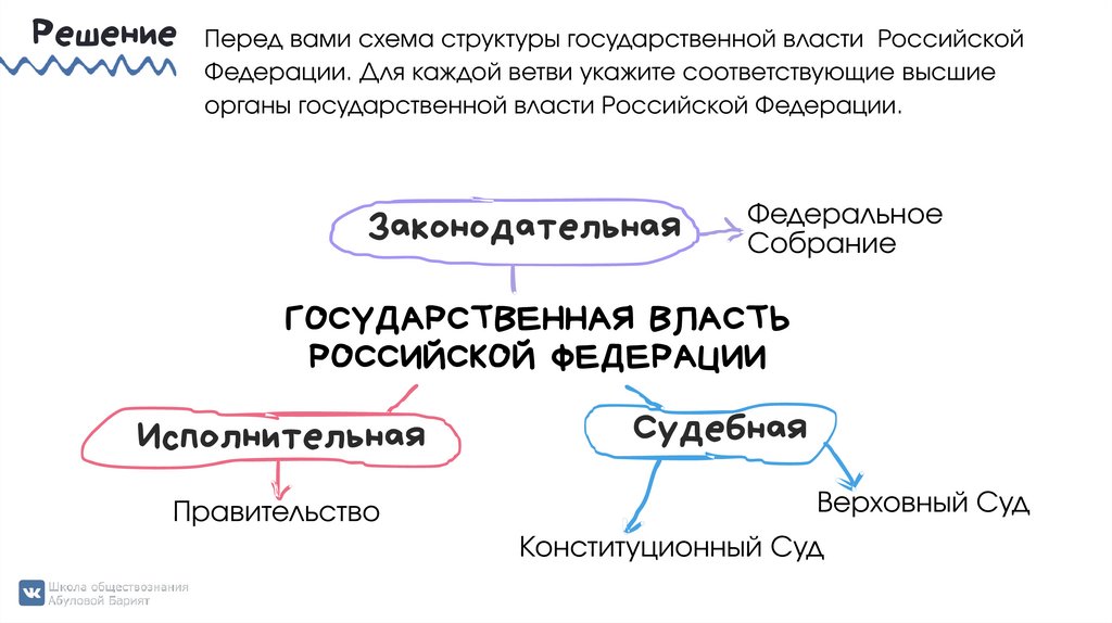 Решение Перед вами схема структуры государственной власти РоссийскойФедерации. Для каждой ветви укажите соответствующие высшие