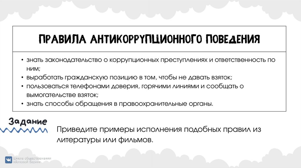 • выработать гражданскую позицию в том, чтобы не давать взяток;