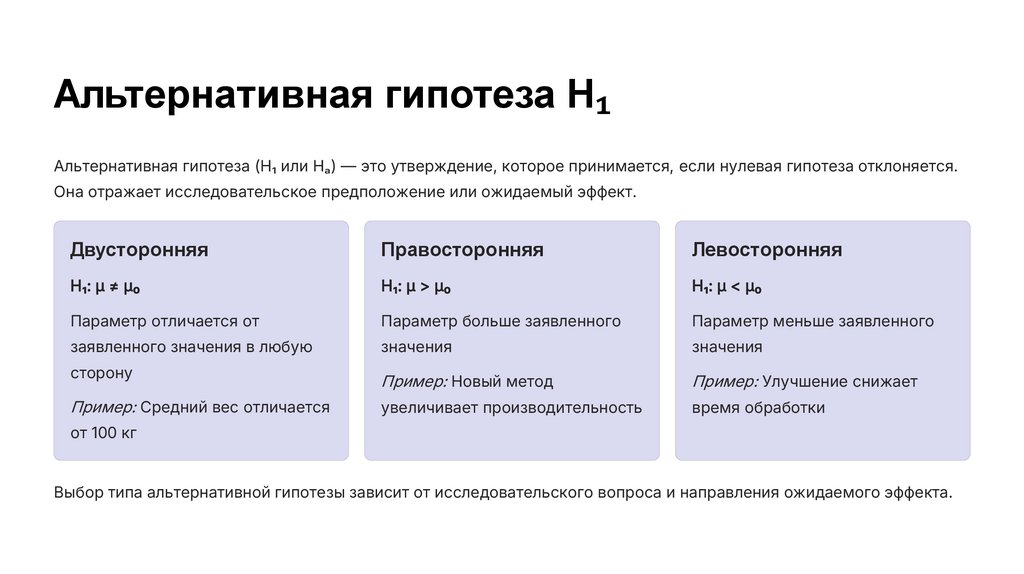Выбор типа альтернативной гипотезы зависит от исследовательского вопроса и направления ожидаемого эффекта.
