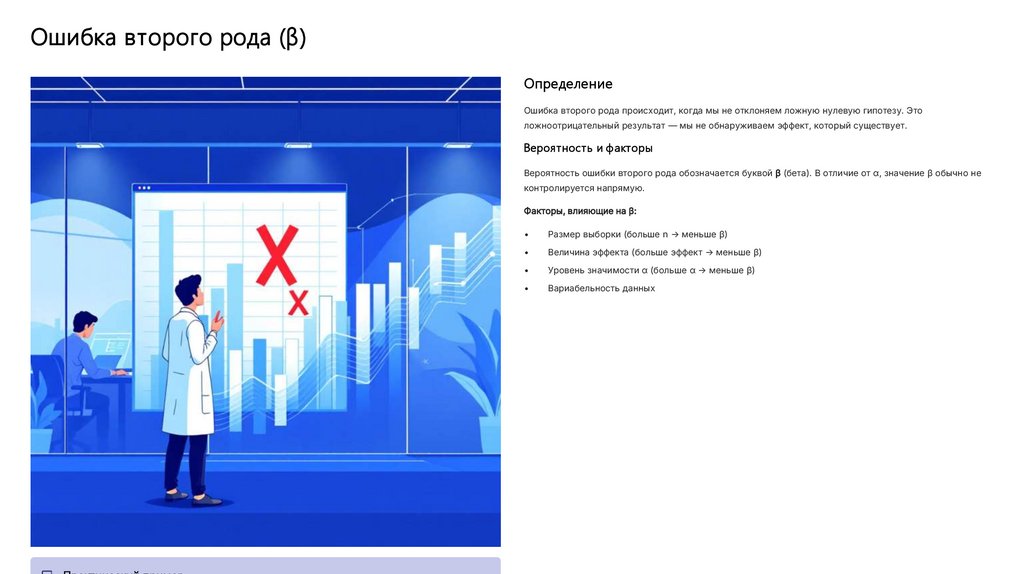Вероятность ошибки второго рода обозначается буквой β (бета). В отличие от α, значение β обычно не