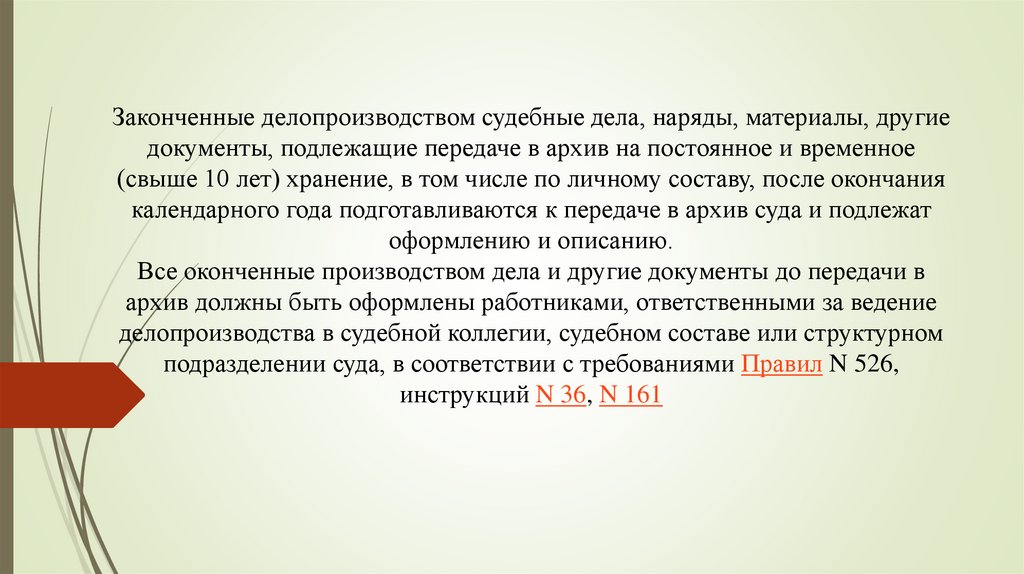 Законченные делопроизводством судебные дела, наряды, материалы, другиедокументы, подлежащие передаче в архив на постоянное и временное