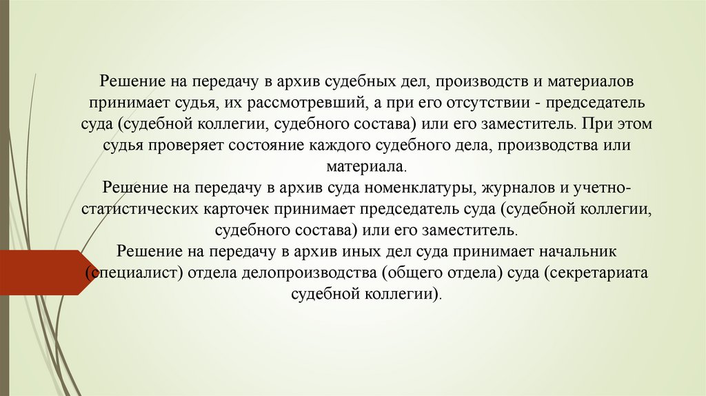 Решение на передачу в архив судебных дел, производств и материаловпринимает судья, их рассмотревший, а при его отсутствии - председатель
