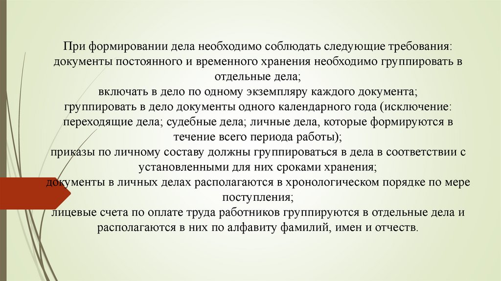 При формировании дела необходимо соблюдать следующие требования:документы постоянного и временного хранения необходимо группировать в