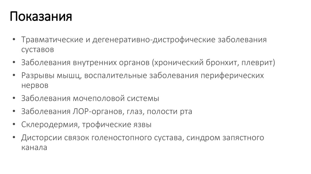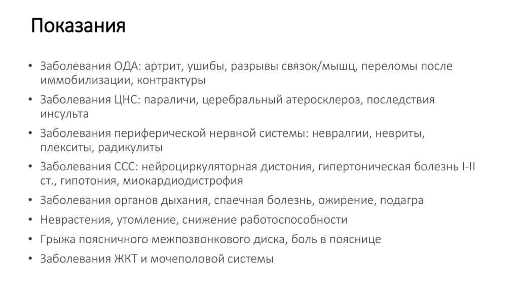 Показания• Заболевания ОДА: артрит, ушибы, разрывы связок/мышц, переломы после