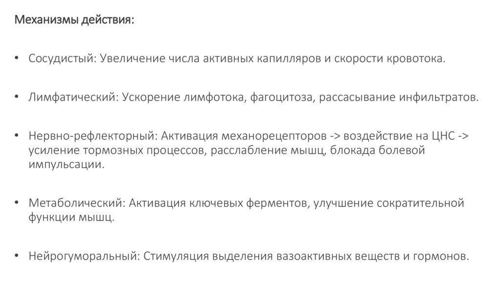 • Лимфатический: Ускорение лимфотока, фагоцитоза, рассасывание инфильтратов.
