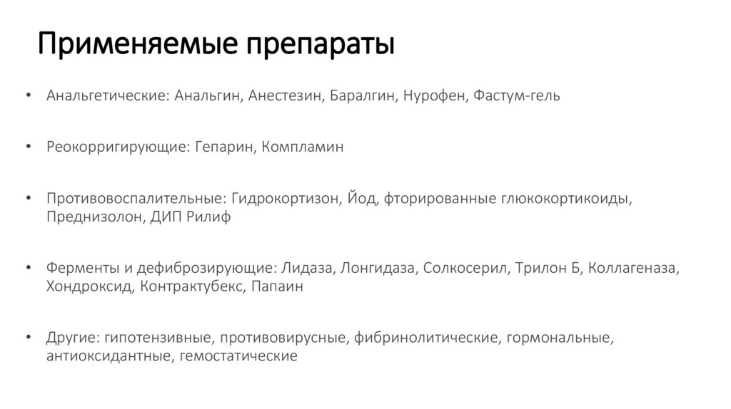 • Ферменты и дефиброзирующие: Лидаза, Лонгидаза, Солкосерил, Трилон Б, Коллагеназа,
