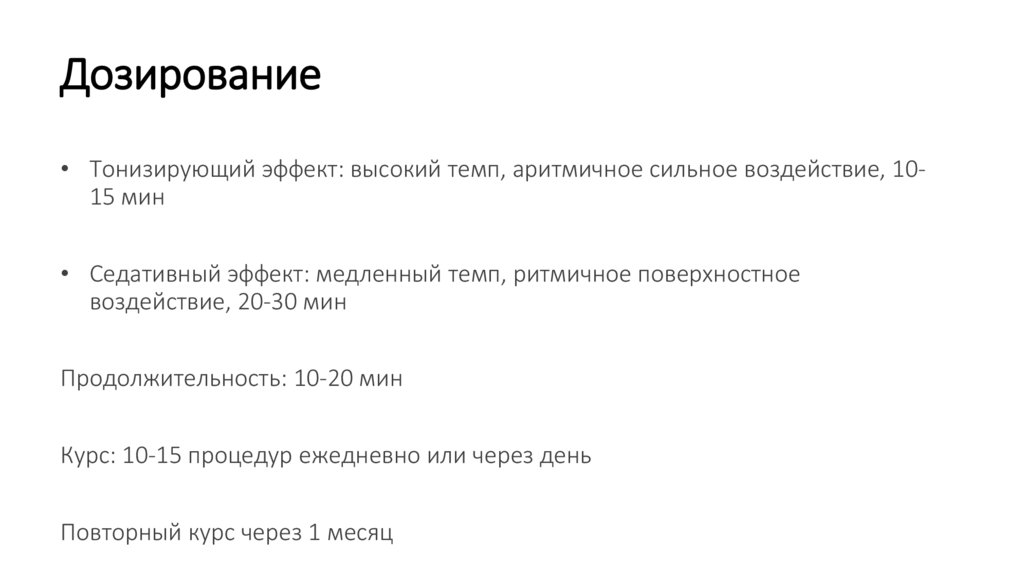 Дозирование• Тонизирующий эффект: высокий темп, аритмичное сильное воздействие, 1015 мин