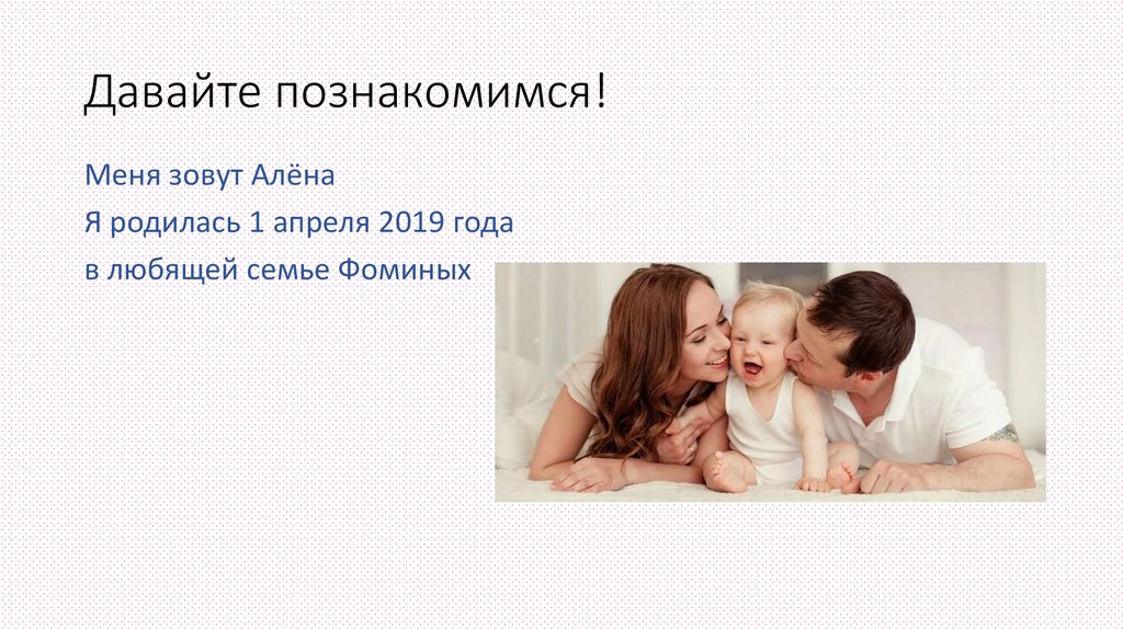 Меня зовут АлёнаЯ родилась 1 апреля 2019 года