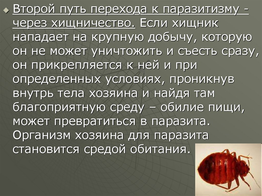 Второй путь перехода к паразитизму через хищничество. Если хищникнападает на крупную добычу, которую
