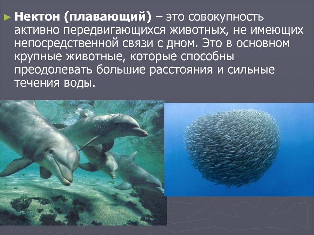 ► Нектон (плавающий) – это совокупностьактивно передвигающихся животных, не имеющих