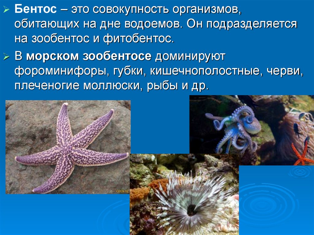 Бентос – это совокупность организмов,обитающих на дне водоемов. Он подразделяется