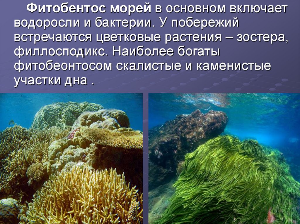 Фитобентос морей в основном включаетводоросли и бактерии. У побережий