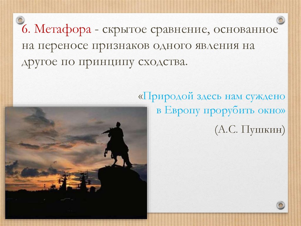 6. Метафора - скрытое сравнение, основанноена переносе признаков одного явления на