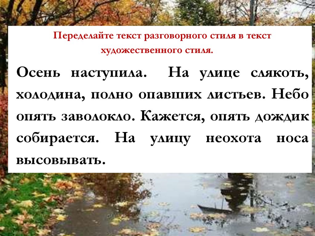 Переделайте текст разговорного стиля в текстхудожественного стиля.
