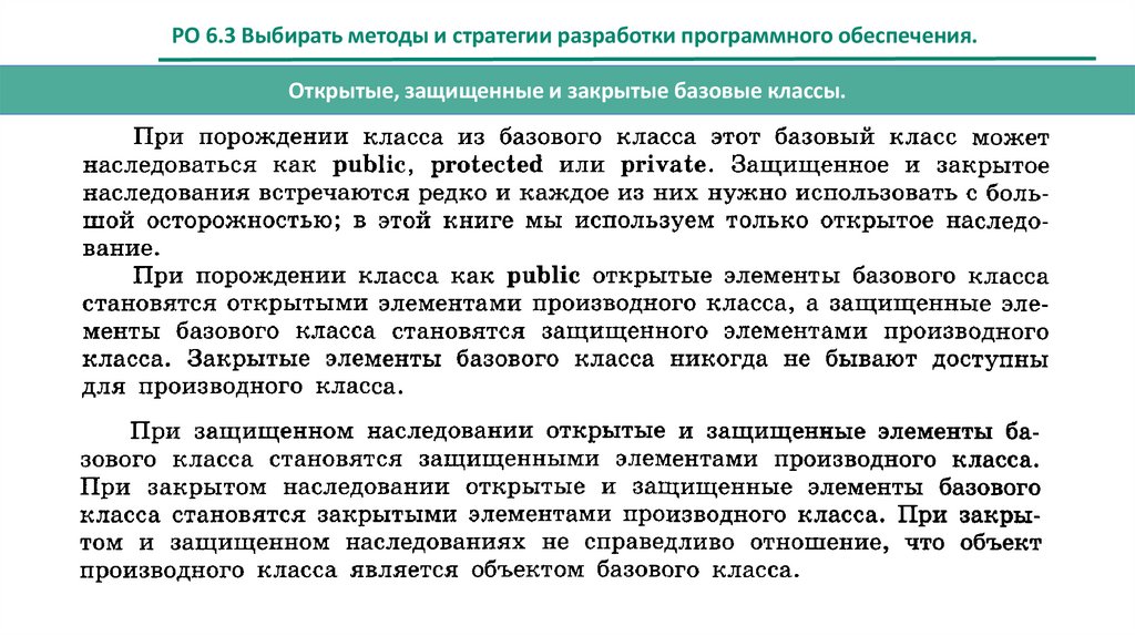 РО 6.3 Выбирать методы и стратегии разработки программного обеспечения.Открытые, защищенные и закрытые базовые классы.