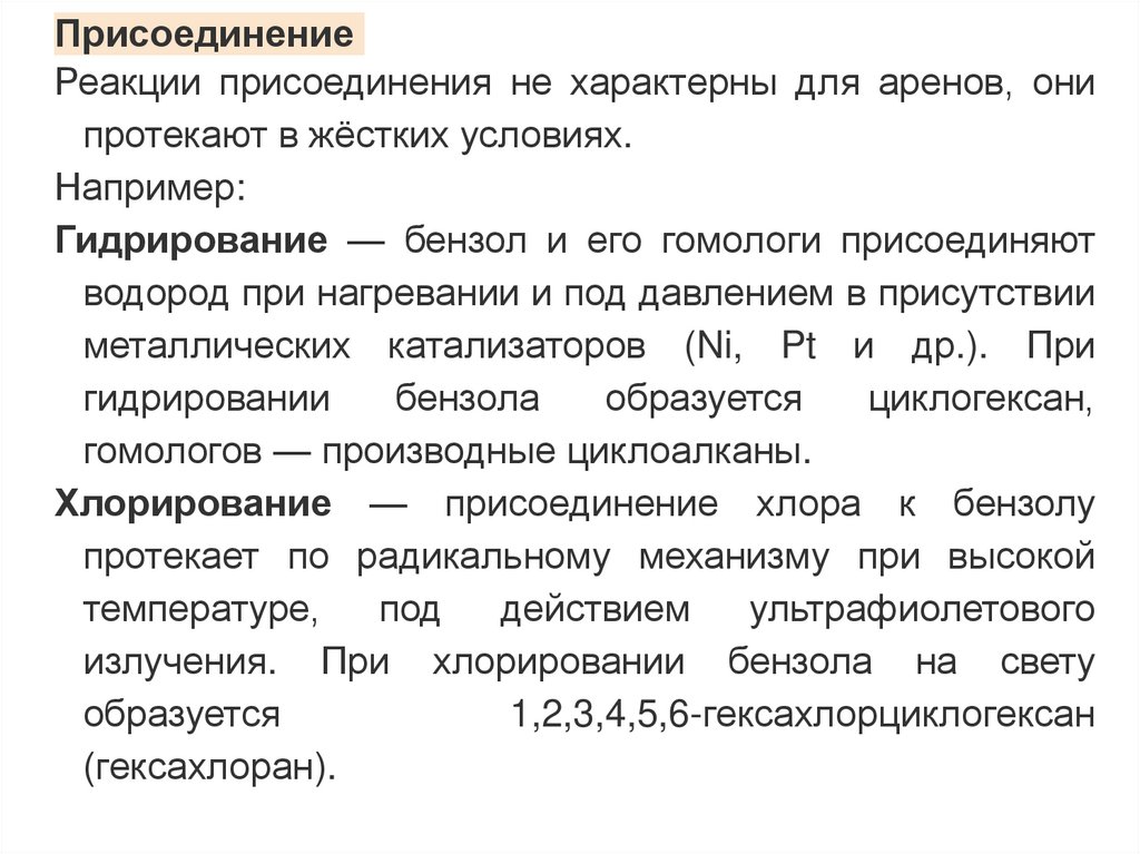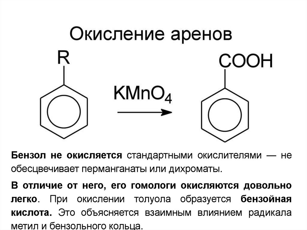 Бензол не окисляется стандартными окислителями — необесцвечивает перманганаты или дихроматы.