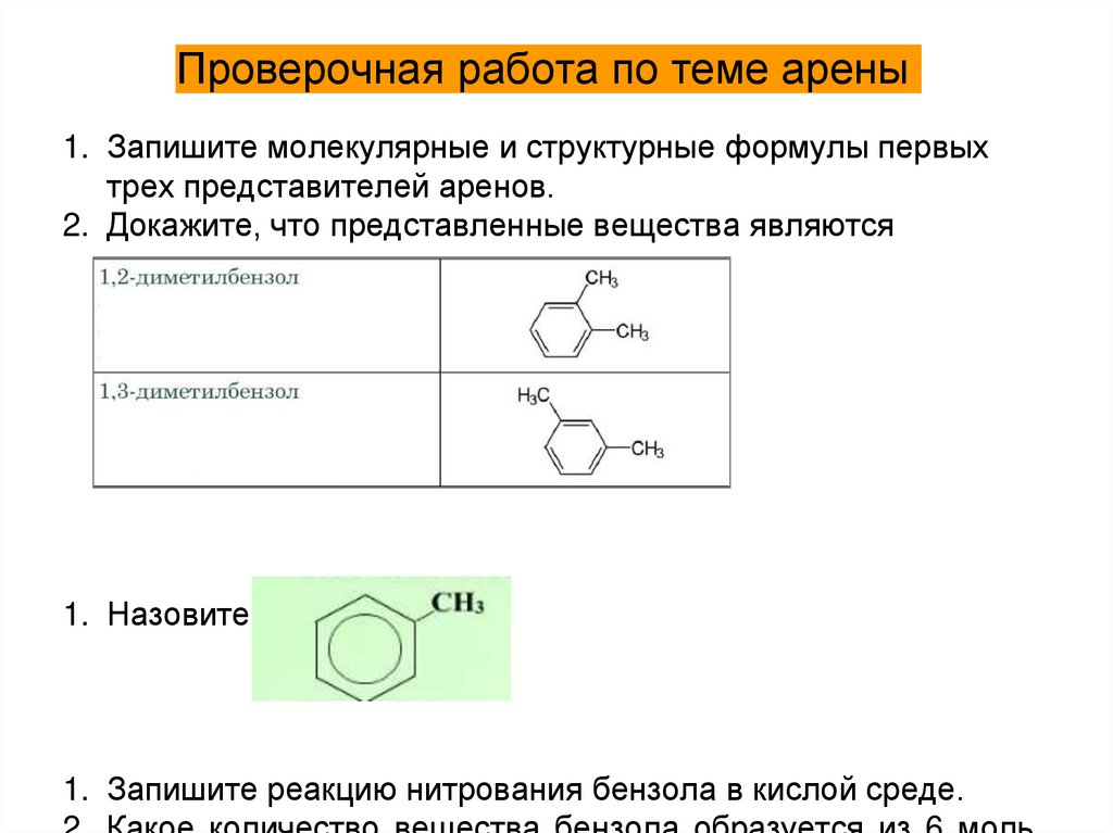 Проверочная работа по теме арены1. Запишите молекулярные и структурные формулы первых