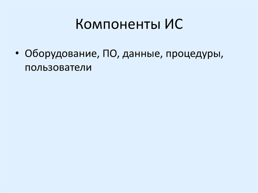 Компоненты ИС• Оборудование, ПО, данные, процедуры,