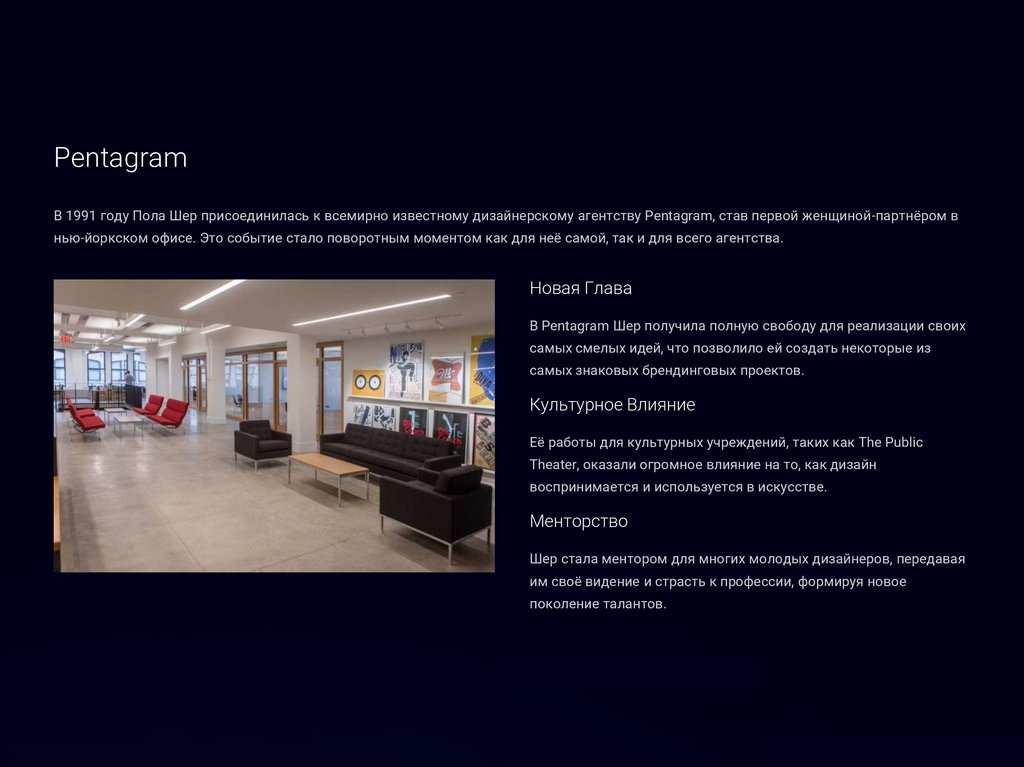 PentagramВ 1991 году Пола Шер присоединилась к всемирно известному дизайнерскому агентству Pentagram, став первой женщиной-партнёром в