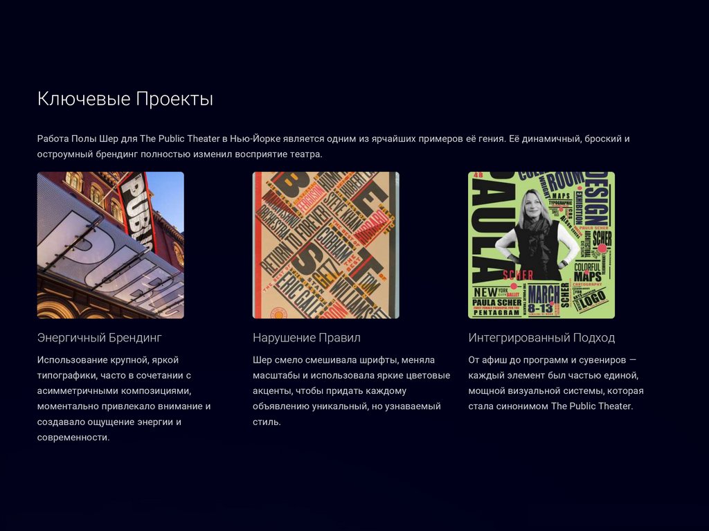Ключевые ПроектыРабота Полы Шер для The Public Theater в Нью-Йорке является одним из ярчайших примеров её гения. Её динамичный, броский и