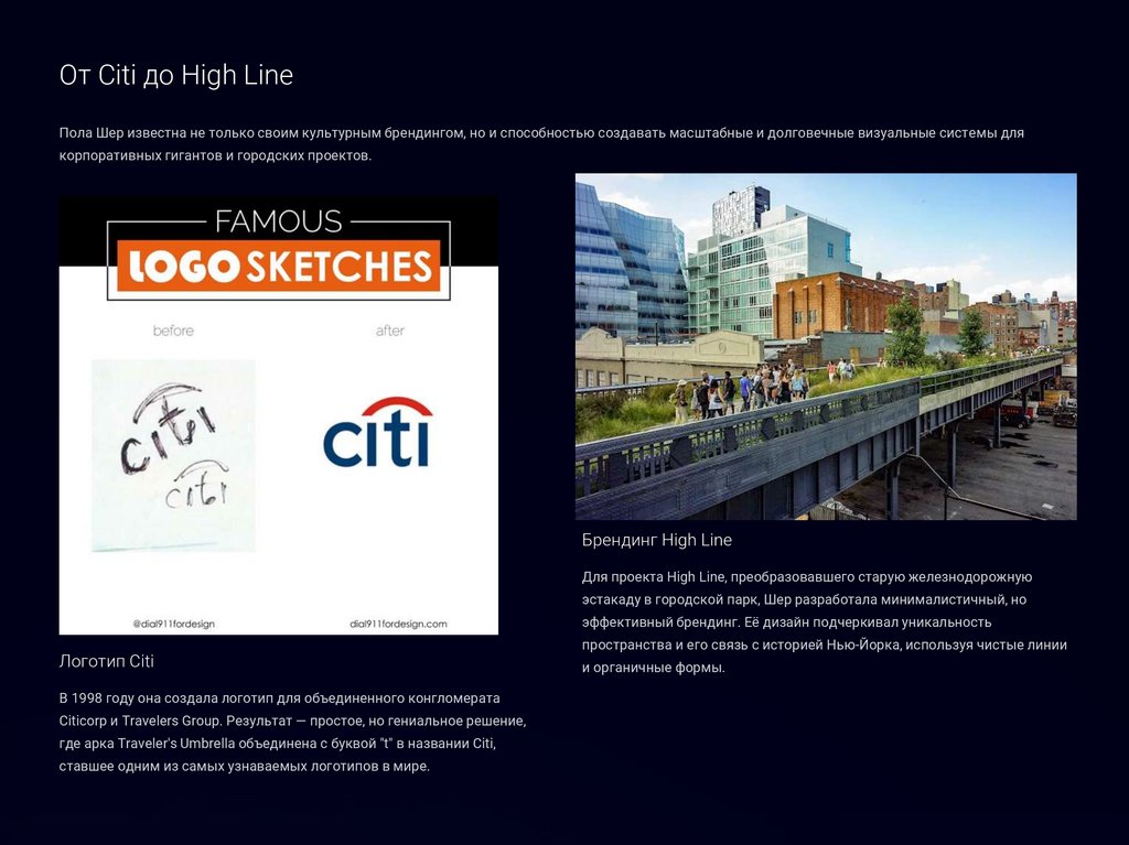 От Citi до High LineПола Шер известна не только своим культурным брендингом, но и способностью создавать масштабные и долговечные визуальные системы для