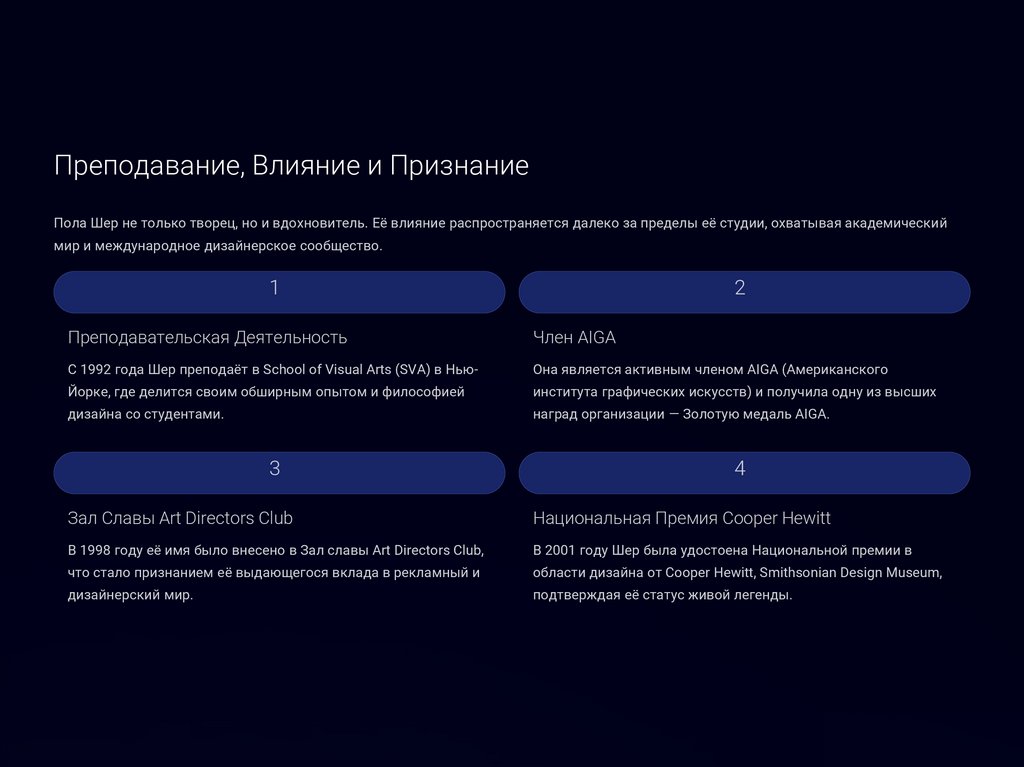 Преподавание, Влияние и ПризнаниеПола Шер не только творец, но и вдохновитель. Её влияние распространяется далеко за пределы её студии, охватывая академический