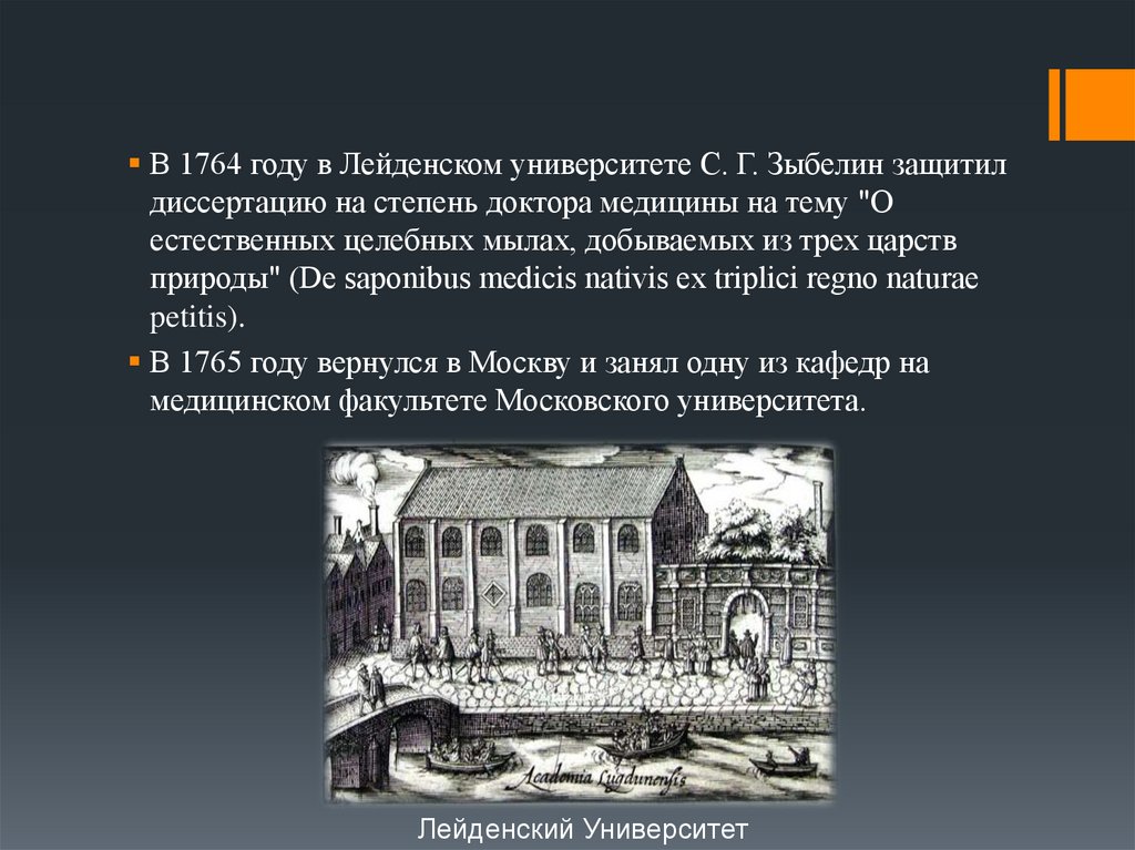 В 1764 году в Лейденском университете С. Г. Зыбелин защитилдиссертацию на степень доктора медицины на тему "О