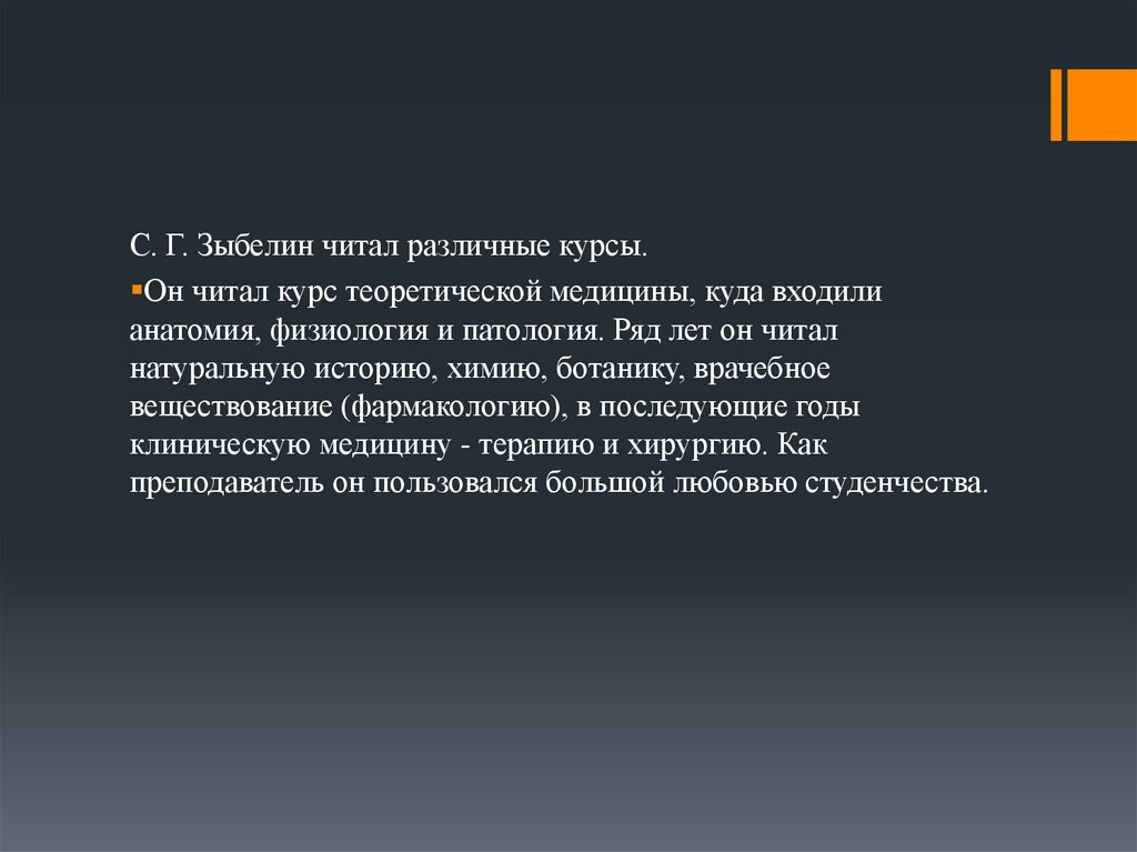 С. Г. Зыбелин читал различные курсы.Он читал курс теоретической медицины, куда входили