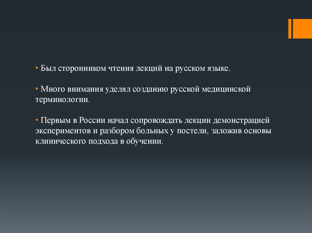 • Был сторонником чтения лекций на русском языке.• Много внимания уделял созданию русской медицинской