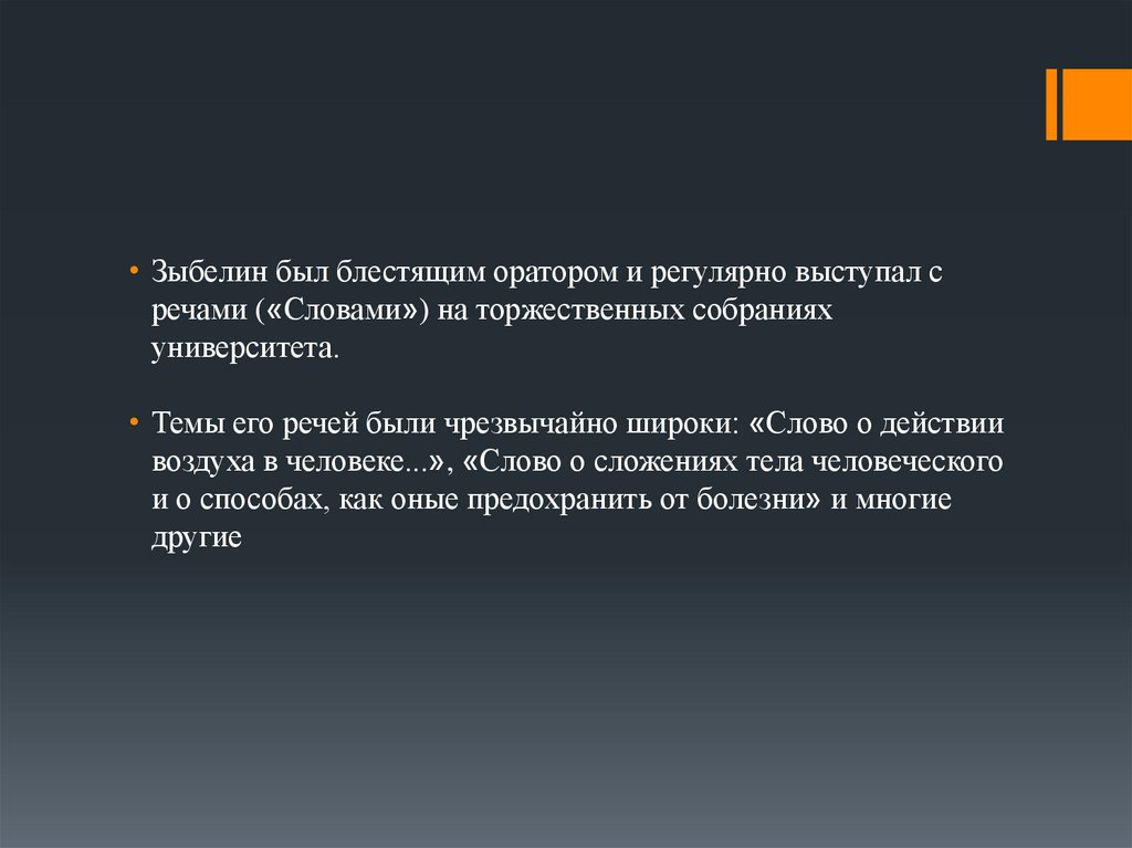 • Зыбелин был блестящим оратором и регулярно выступал сречами («Словами») на торжественных собраниях