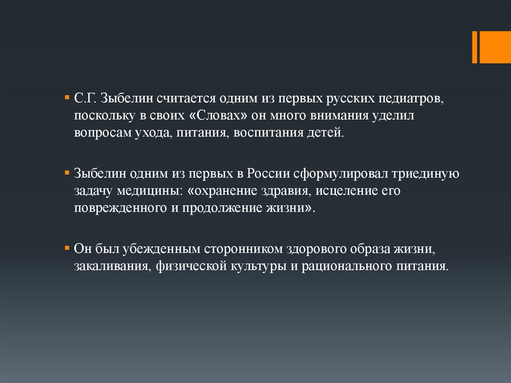 С.Г. Зыбелин считается одним из первых русских педиатров,поскольку в своих «Словах» он много внимания уделил