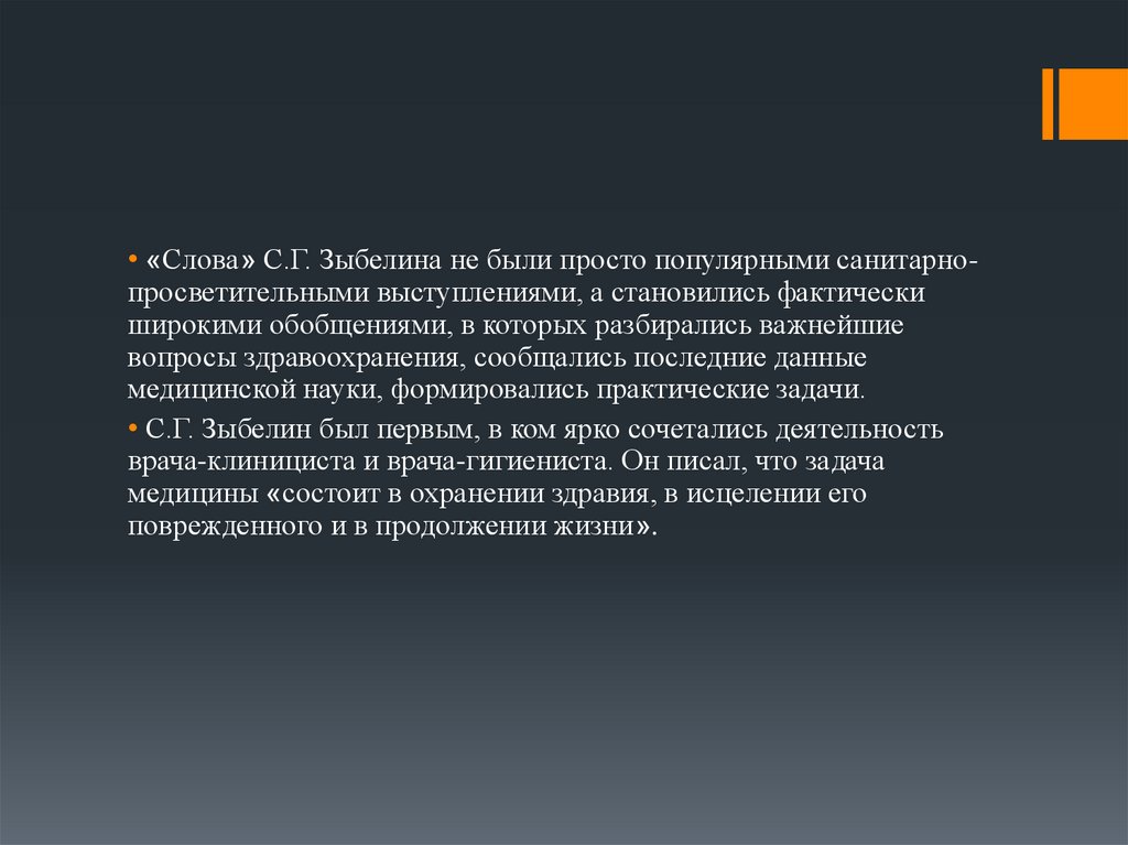 • «Слова» С.Г. Зыбелина не были просто популярными санитарнопросветительными выступлениями, а становились фактическиширокими обобщениями, в которых разбирались важнейшие
