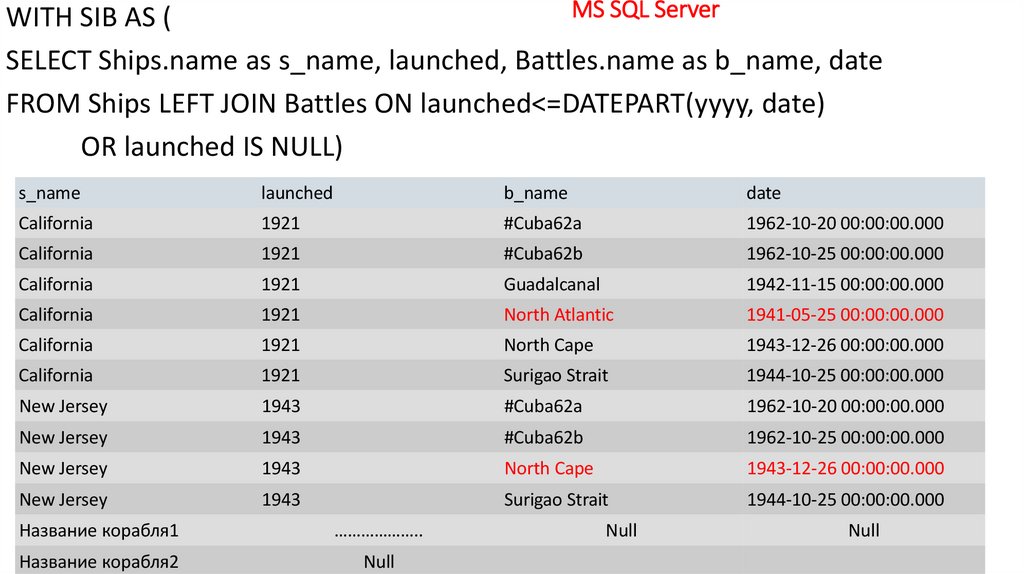 Если нет сражения, произошедшего после спуска на воду корабля, вывести NULL вместо