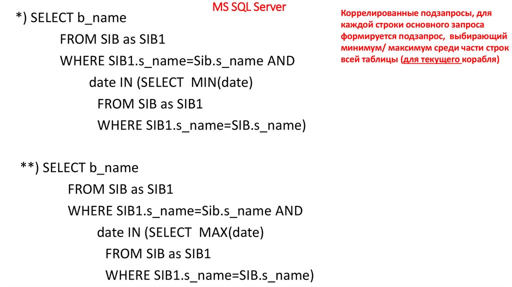 Для каждого корабля из таблицы Ships указать название первого по времени сраженияиз таблицы Battles, в котором корабль мог бы участвовать после спуска на воду.