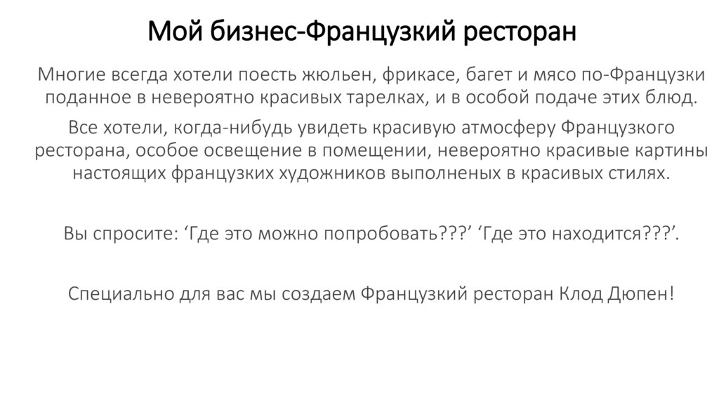 Мой бизнес-Французкий ресторанМногие всегда хотели поесть жюльен, фрикасе, багет и мясо по-Французки