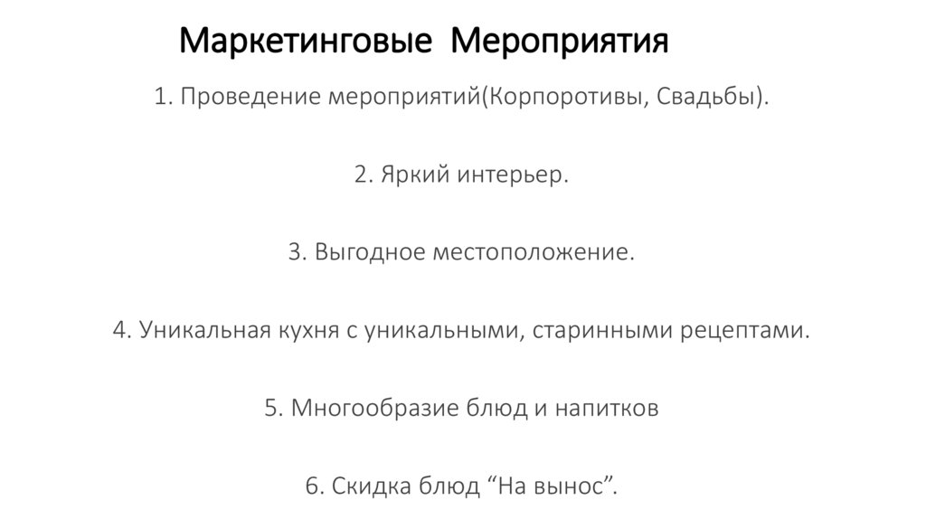Маркетинговые Мероприятия1. Проведение мероприятий(Корпоротивы, Свадьбы).