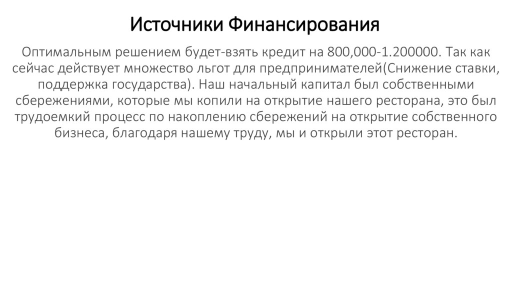 Источники ФинансированияОптимальным решением будет-взять кредит на 800,000-1.200000. Так как