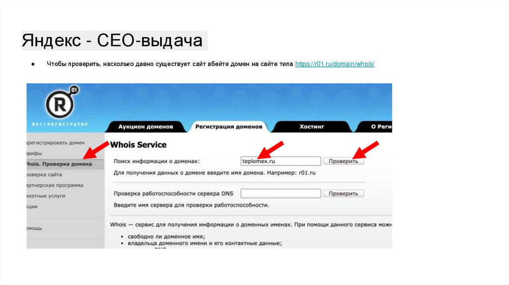 Яндекс - СЕО-выдачаЧтобы проверить, насколько давно существует сайт вбейте домен на сайте типа https://r01.ru/domain/whois/