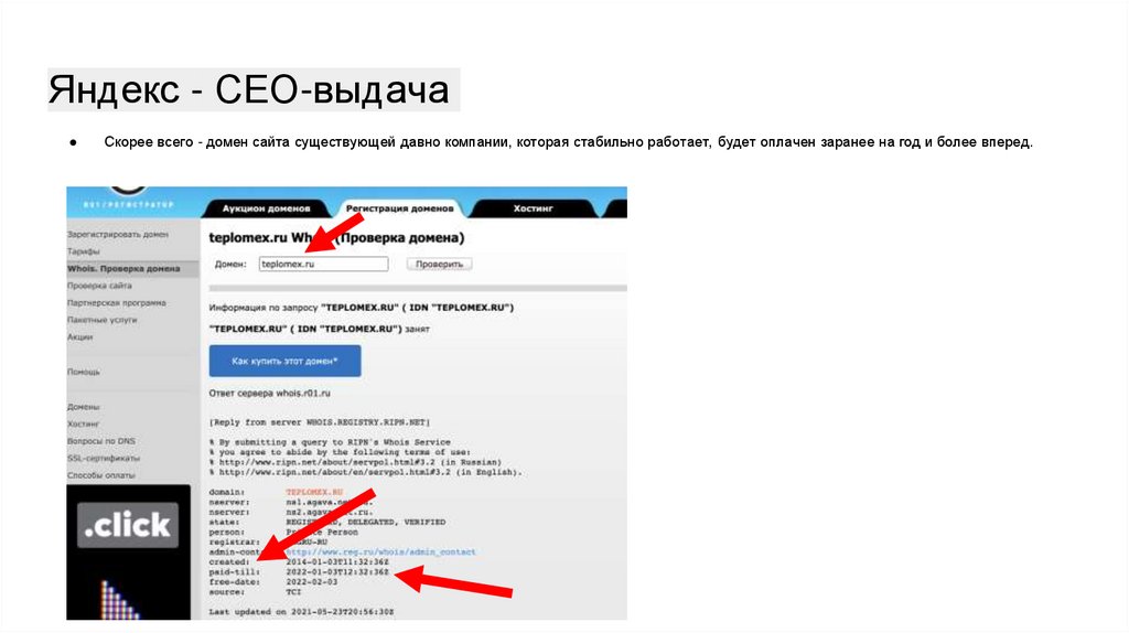 Яндекс - СЕО-выдачаСкорее всего - домен сайта существующей давно компании, которая стабильно работает, будет оплачен заранее на год и более вперед.