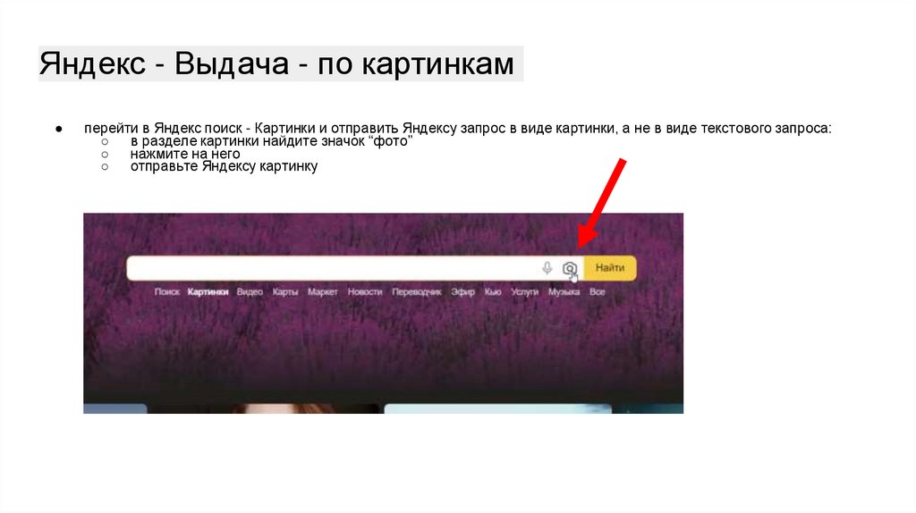 Яндекс - Выдача - по картинкамперейти в Яндекс поиск - Картинки и отправить Яндексу запрос в виде картинки, а не в виде текстового запроса: